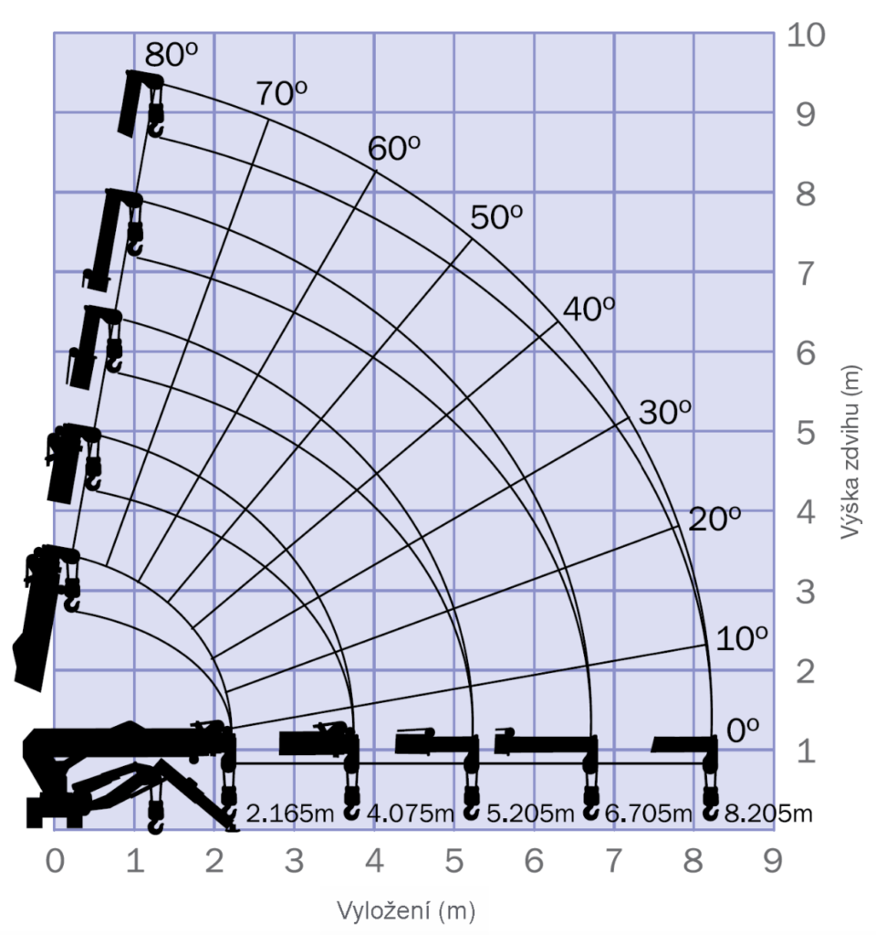 | Vysunutí výložníku 4,075 m | Vysunutí výložníku 5,575 m | Vysunutí výložníku 7,075 m | Vysunutí výložníku 8,575 m | ||||