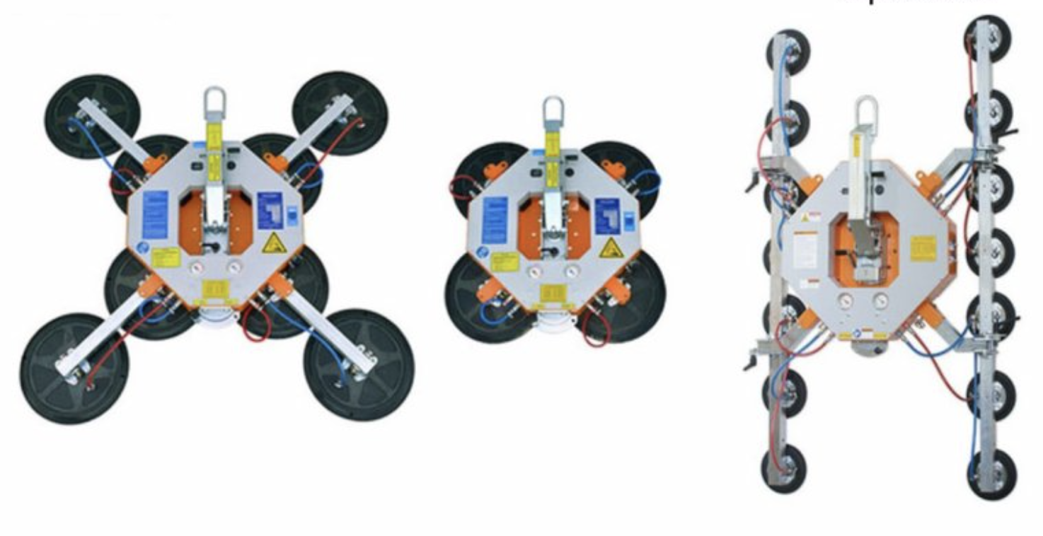 Přísavku je možné zavěsit na hák jeřábu nebo jiného zdvihacího zařízení. Po demontáži závěsného ramene může být přísavka napevno zajištěna k vahadlu, což zajistí instalaci skla pod převisem v perfektní svislé poloze.